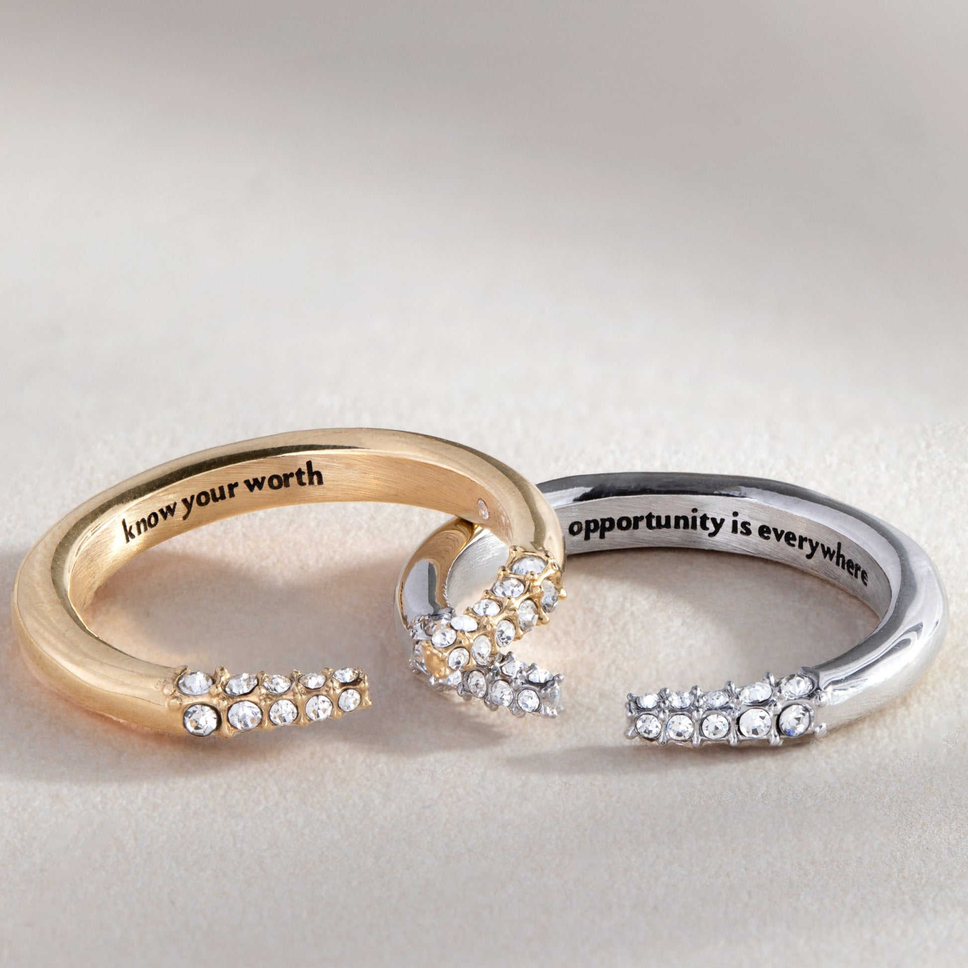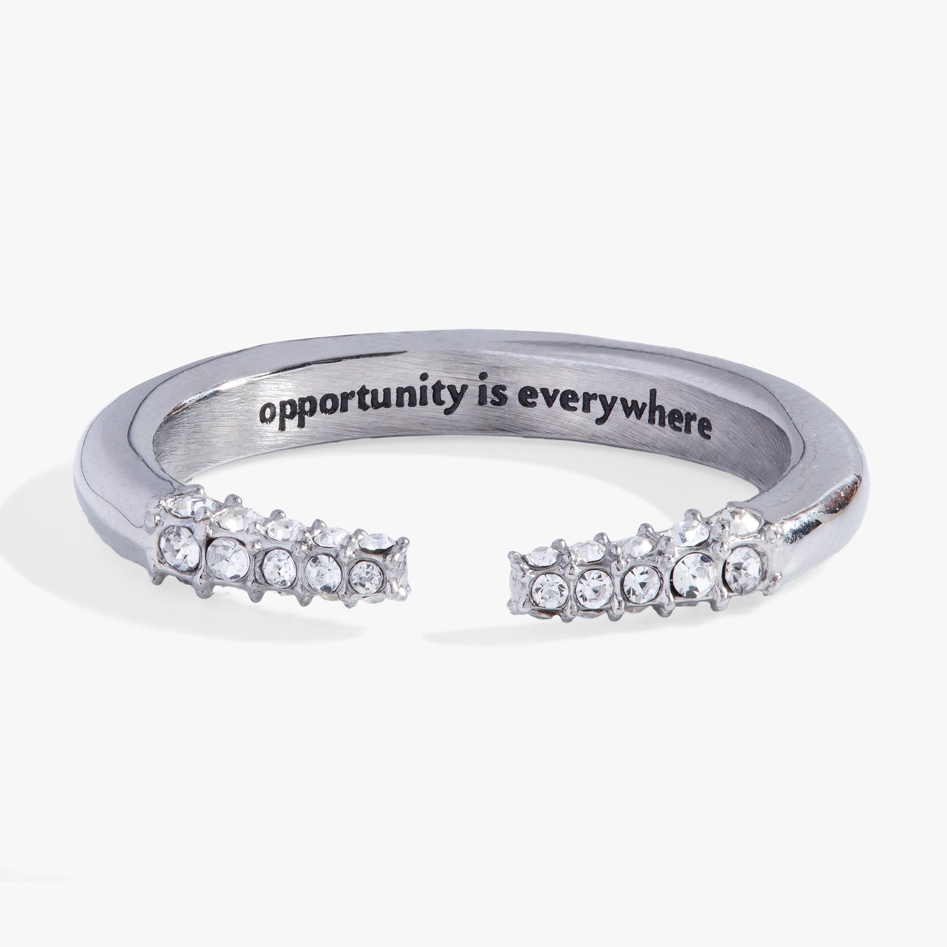 Look around you and you’ll see a world of possibilities just waiting for you to find them. This “Know Your Worth” Open Tusk Ring is a silver-tone stainless steel open ring, with tusk-shaped tapered ends encrusted in sparkling crystals. Inside, it’s engraved with the mantra “Opportunity is Everywhere.” Because it’s silver-tone stainless steel, it’s durable and scratch-resistant — so you can wear it as an everyday reminder that you’ve got the power to find amazing opportunities and use them to manifest your dreams.