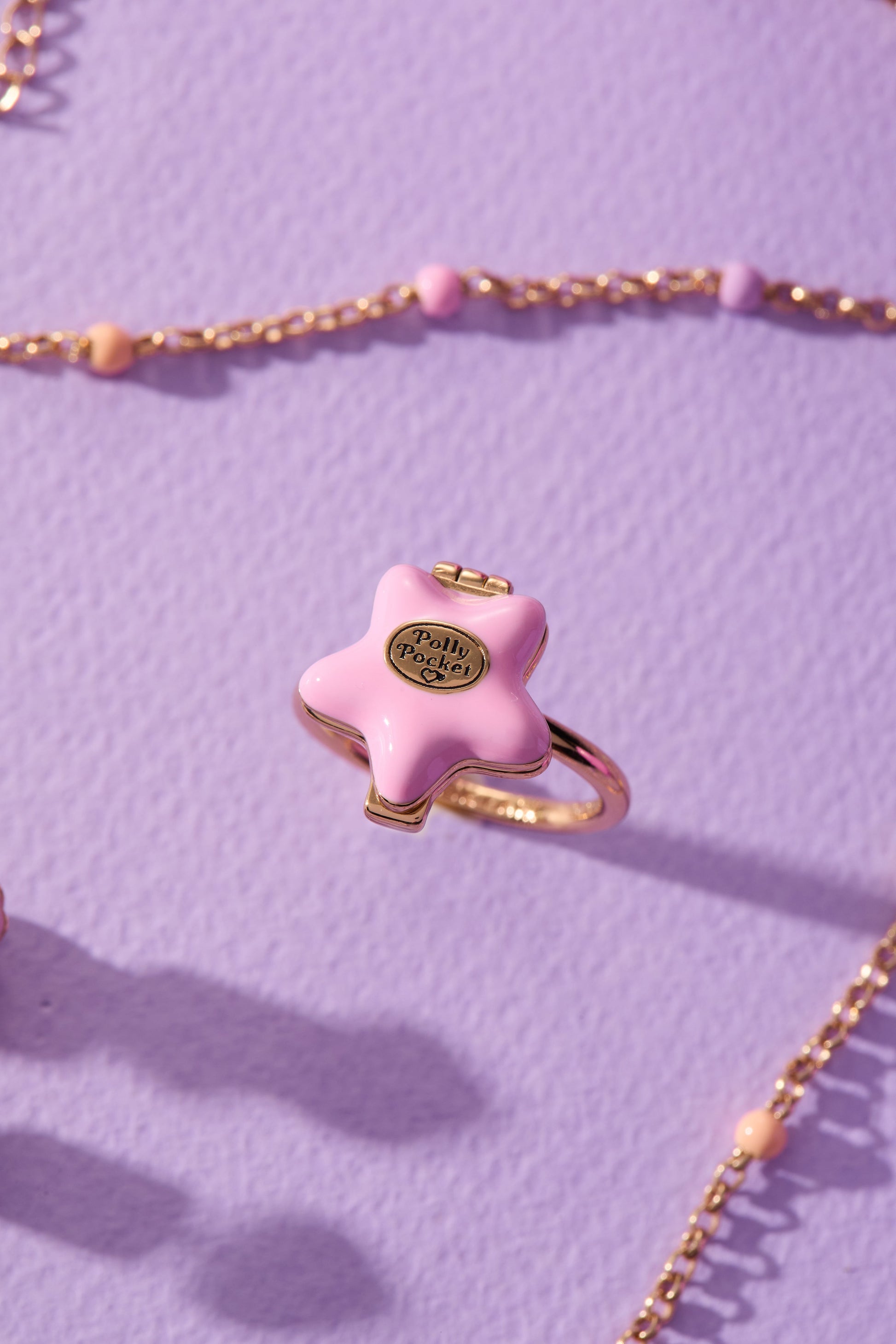 The Polly Pocket™ Locket Ring features a pink star-shaped top with the Polly Pocket™ logo. When opened, it reveals the charming quote "Tiny and Cute" encircled by classic heart designs. Its pastel enamel adds a playful touch, making it a fun and versatile accessory that celebrates nostalgic love for Polly Pocket™ with delightful hidden surprises.